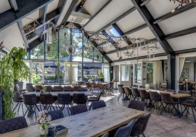 Deze zaal is rondom voorzien van glas en heeft een fijn interieur, heerlijke stoelen en landelijk, robuust eikenhouten tafels.